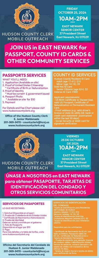 Posted September 23, 2024Join us for the Hudson County Clerk's Mobile Outreach Event in East Newark, where you can easily access services like passport applications, county ID cards, and other community services!