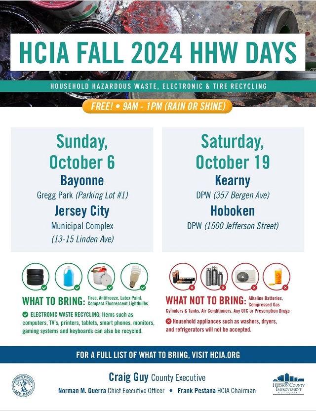 Posted September 26, 2024Hudson County Improvement Authority (HCIA) is hosting its Fall 2024 HHW Days for safe disposal and recycling of household hazardous waste, electronics, and tires. This is a free event open to all Hudson County residents!