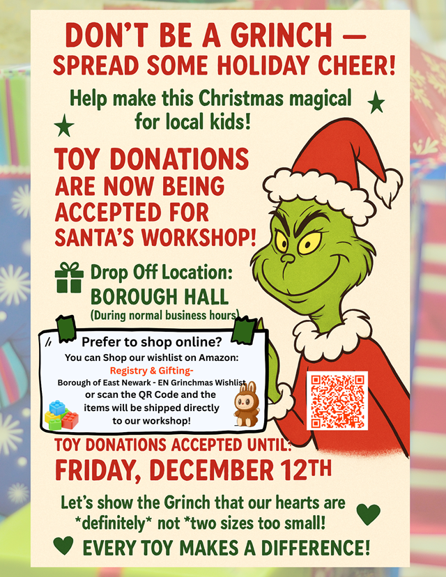 The Borough of East Newark is now accepting toy donations to bring joy to local kids this holiday season. Every toy makes a difference—and together, we can show the Grinch just how big our hearts really are!